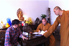梅先生同少林寺方丈釋永信大師、少林藥局局長釋延琳大法師研討《百花散》的神奇功效